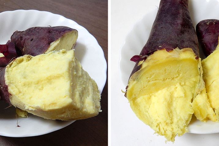 さつまいも(紅あずま)を焼いてみました。左が水で右が石です。両方栗のような食感と甘みに仕上がりました。うーん、とくに味に違いは感じられず