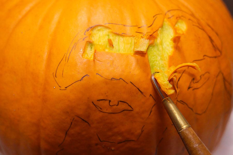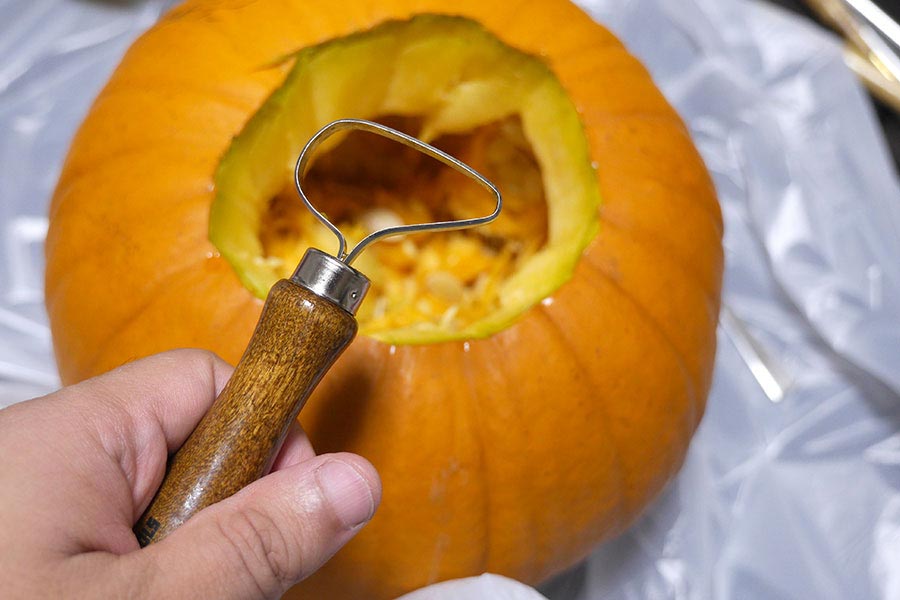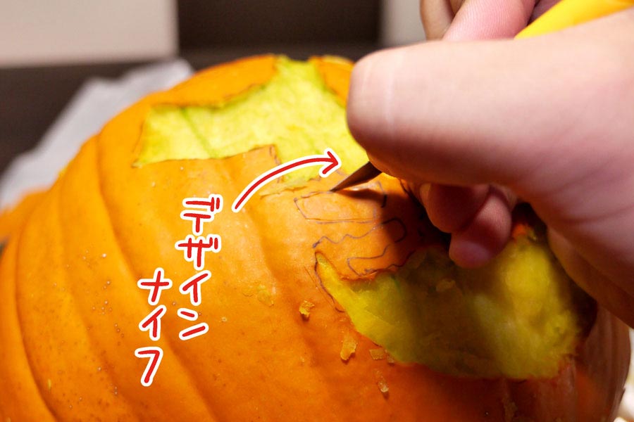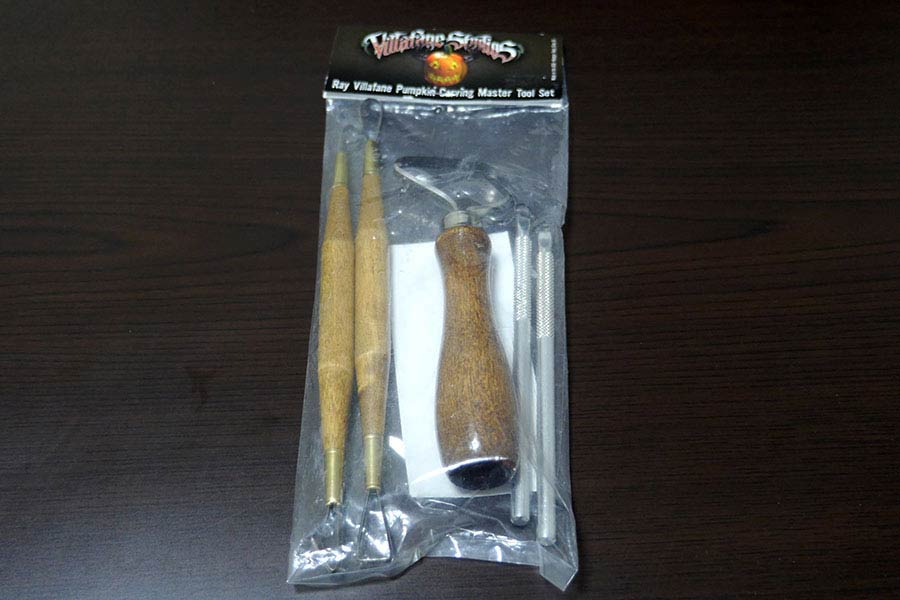 あのカボチャさえ手に入れちゃえば、あとはナイフとスプーンなどで、スタンダードなジャック・オー・ランタンは比較的カンタンに作れるのですが、今回は専用の道具を使用して、もうちょっと難しいものを作ってみたいと思います。