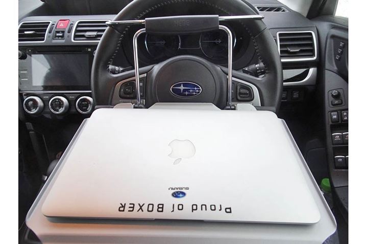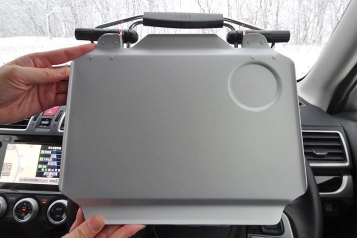 値段はややお高い分、安定感と剛性感は抜群で、脱着性も文句なし。金属製で作りがゴツイため、外したときの置き場にちょっと困るのが唯一の難点ですが、ノートPCを使った原稿執筆にバッチリです。角度や位置が細かく調整できるので、シートポジションやステアリングの位置調整機構と合わせれば、調整幅はかなり大きいのもいいですね。個人的に車内用トレイに求めたいポイントのすべてが満足できるアイテムです。長年にわたり探し求めていたものとついに出会えたという感じでした。