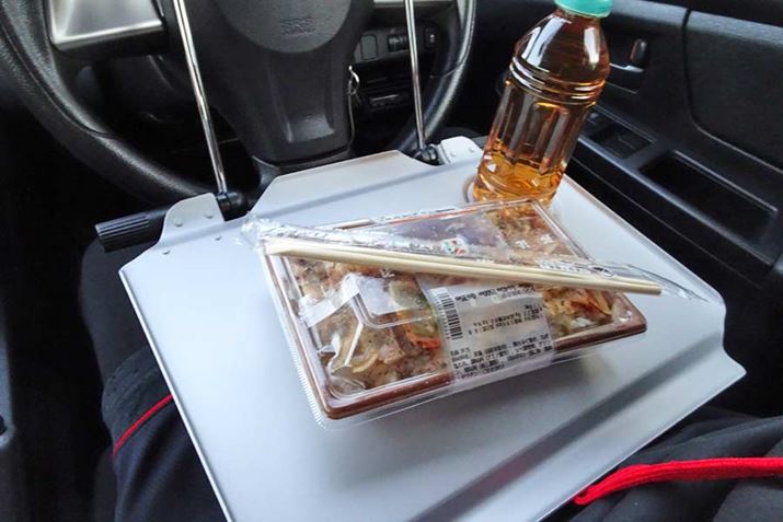 愛してやまない豚塩カルビ丼(麦飯)など、レンジで温めたコンビニ弁当はふたを開ける際に湯気のしずくが落ちる難点がありますが、このテーブルがあれば車内や自分の体をぬらす恐れはありません