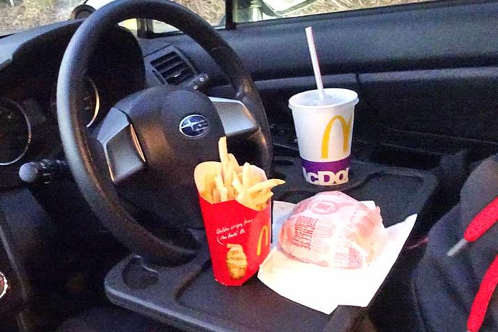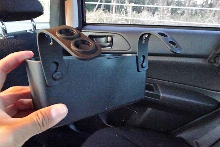 トレイ自体は多機能で、ハンバーガーが3つほど置ける余裕があり、ドリンクやフライドポテトを保持する能力も高いのですが、取り付け用のベルトでのホールド性が頼りなく、安定性に一抹の不安を覚えるのが惜しまれました。停車中に使う分には問題ありませんが、運転中は使用せずに折りたたんでください。軽量かつ折りたたんでしまえばかさばらないので、クルマに積んでおけば食事のときに便利だと思います。
