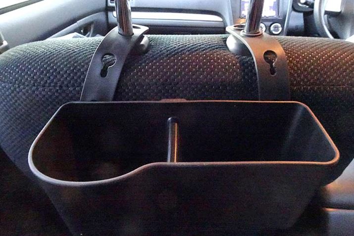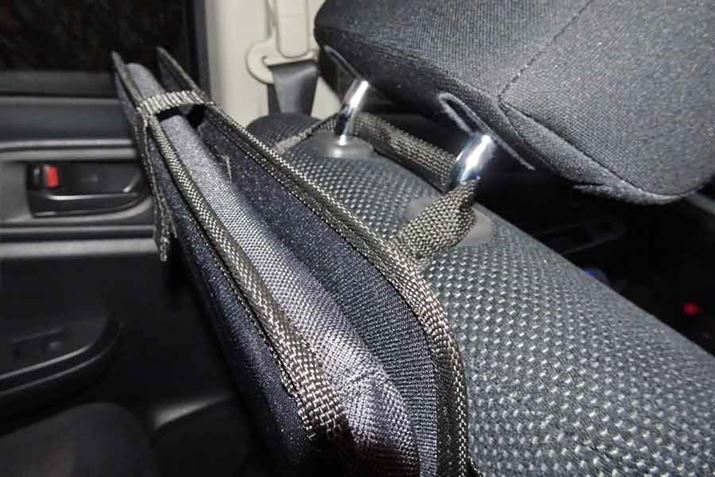 ベルトで引っ掛けるタイプなので、ヘッドレストが抜けないクルマでも取り付け可能です。ヘッドレストがシートと一体式のクルマには使えませんのでご注意を