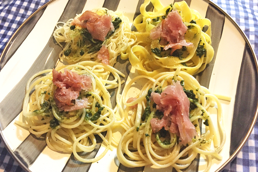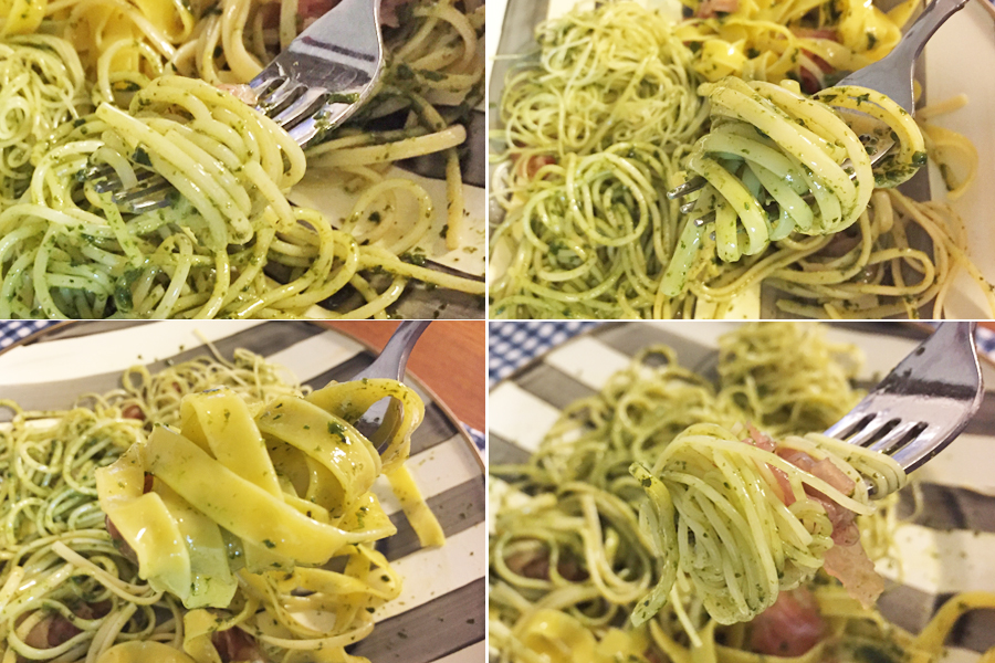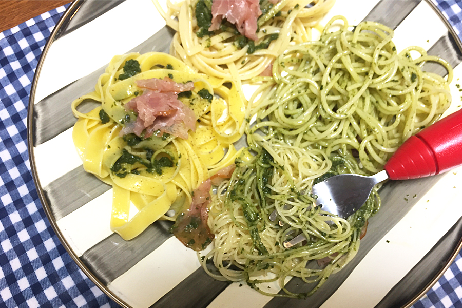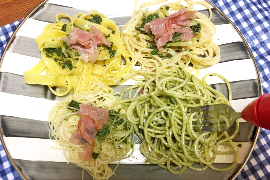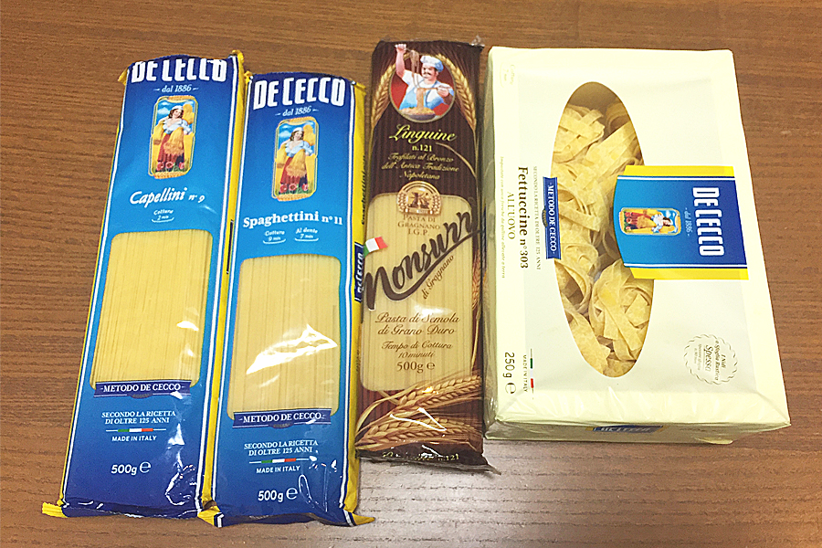 そうめんぐらい細いカッペリーニ、よく見かける太さのスパゲッティーニ、もっちりして楕円形の断面のリングイネ、平たくてきしめんのようなフィットチーネ! ぜんぜん違う4種類のパスタを用意してみました。