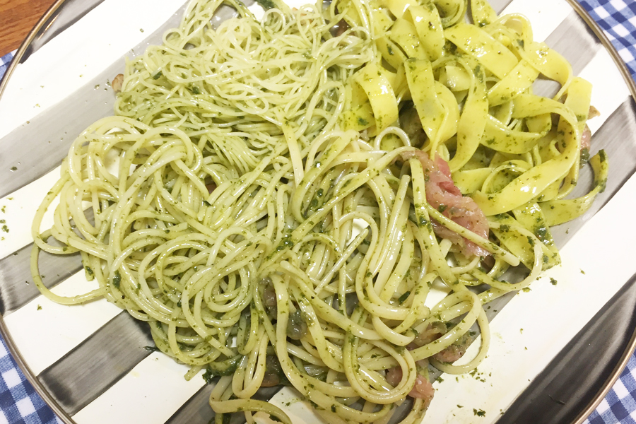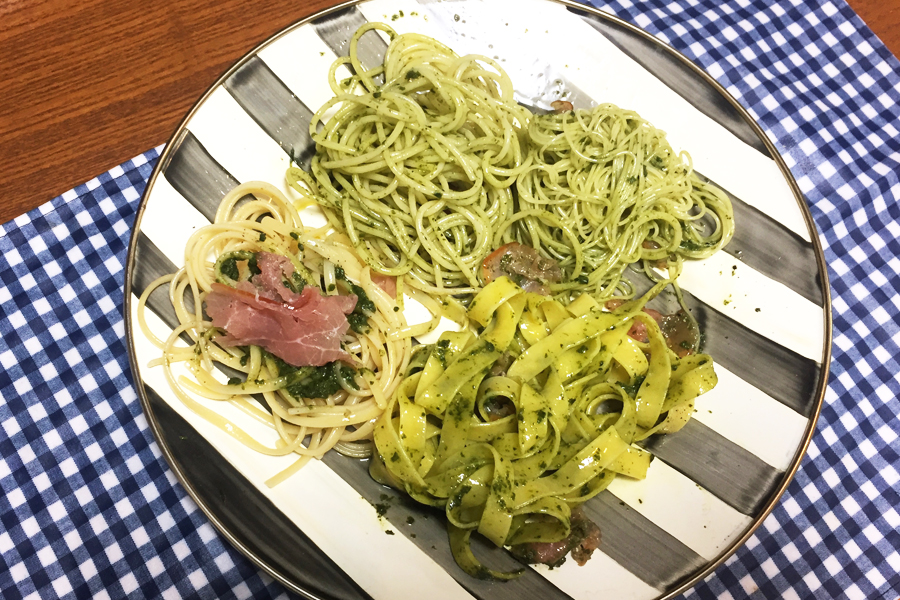 それぞれをゆでて、ペパーミントの一番大好きな味、「ジェノベーゼ」にしてみました!