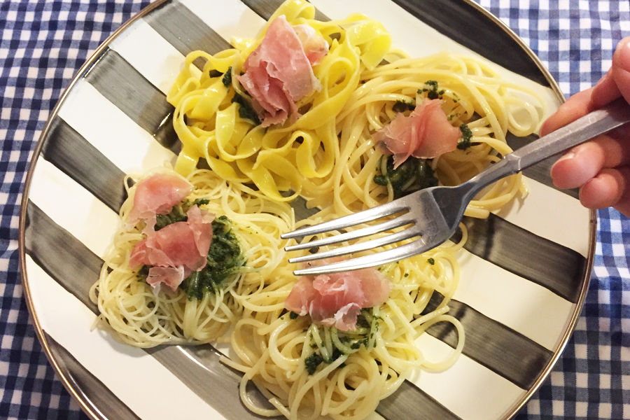 最初は全部のパスタをぐるぐると、ただかき混ぜちゃったのですが。笑