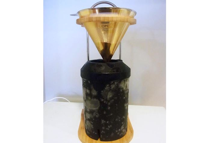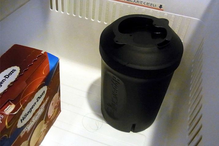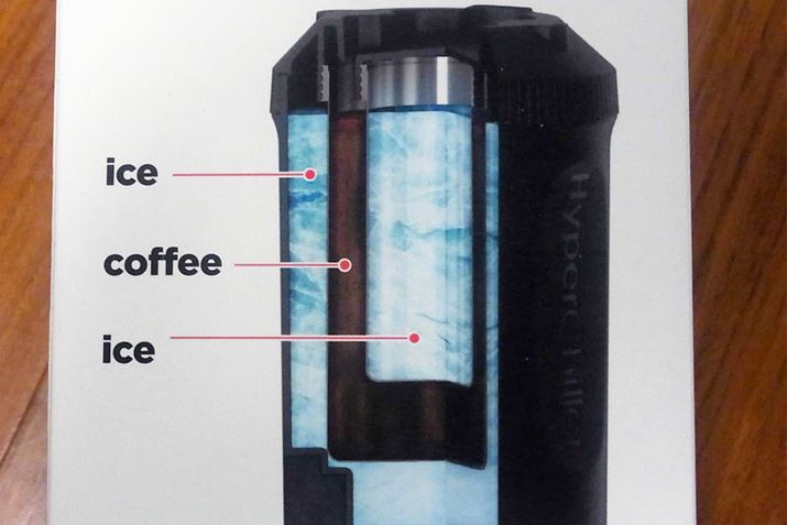筆者が見つけてきたのは、「ハイパーチラー」という商品。本体にホットコーヒーを注ぎ入れるだけで、60秒待てばアイスコーヒーにしてくれます。まるでマジックのようですが、その仕組みはいたって簡単。内部は3層構造になっており、そのうち2層が氷。もう1層にホットコーヒーを注げば氷によって急速冷却されるというわけ。もちろん、コーヒーと氷が混じり合うことはありません。それでは実際にアイスコーヒーを作ってみましょう。