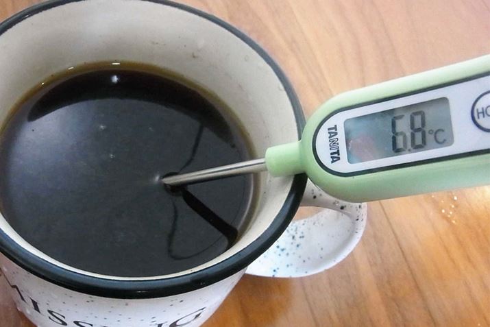 もう一度「ハイパーチラー」にコーヒーを戻して、5分後に測定してみると、約7度まで下がってました。ここまで冷えれば十分です♪