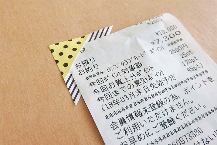 レシート程度の小さな紙なら、対角線上の隅2か所を固定するだけでも十分貼り付けられます