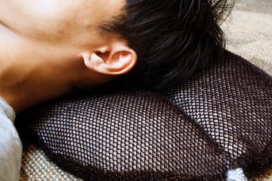 「睡眠用たわし」は、質のよい睡眠に効果的ないくつかの性能を備えています。まずは通気性。睡眠時、頭の温度の適温は体温のマイナス5℃だといわれています。その点、「睡眠用たわし」は従来の枕に比べると暑すぎず寒すぎない温度をキープ。また、外生地のたわしのような毛が、頭皮への適度な刺激になり、スムーズな入眠をサポートします。さらには、撥水性が高いため、毎日でも洗えて清潔さが保てるので、ハウスダスト予防や頭皮のニオイ低減、花粉症対策にも有効だそうです。
