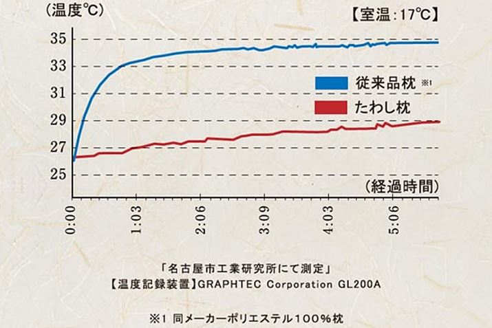 最後に紹介するのは、抱き枕「Feel」。熱の吸収と放出を繰り返す「蓄熱蓄冷マイクロカプセル」を本体の繊維に付着させており、外気温や体温が約32℃以上で吸熱を開始し、約28℃以下で放熱を開始します。つまり、就寝中、「Feel」は28〜32℃の間の一定の温度に保たれ続けるというわけです。