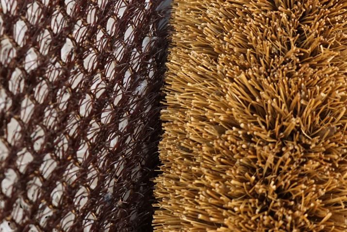 左が「睡眠用たわし」で、右がたわしのアップ写真。たわしほど毛の密度は高くないんですが、触り心地がとても似ています。1本1本はチクチクしていますが、手のひらなど広い面で触るとザラザラした感触