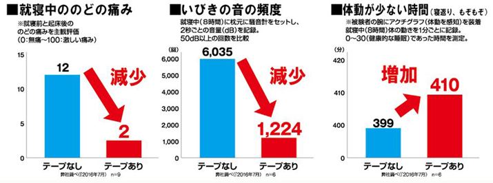 「ナイトミン 鼻呼吸テープ」を使用して就寝した際ののどの痛みやいびきの頻度、身体の動きを調べた結果(小林製薬調べ)。どれもテープなしの状況と比較すると程度が低いようです
