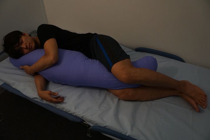 大きく膨らんでいるほうを枕に、もういっぽうの細く曲がっているほうを足で挟みます。そうすると、「Feel」が横向きの際の身体のラインにはまってくれます。腕や足を絡める部分は細くやわらかくなっていて、四肢が無理なく収まります