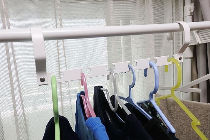 それ以外にも洗濯物を干す際にも活用可能。物干しさおに引っ掛けたうえでハンガー干しの洗濯物を吊せば、穴で固定されるため、風でハンガーがズレることなく、効率よく乾かすことが可能です。取り込む際にも本製品ごと一度に洗濯物を運ぶことができるため、外干しで急な風雨の際にはとても重宝します。