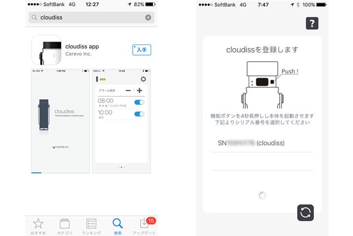 app storeから「cloudiss app」をインストール(左)後にアプリを立ち上げ、cloudissの電源を起動すればBluetoothでペアリングされます