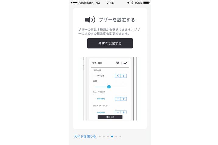 iOS端末とcloudiss本体をペアリングしたら、まずは最も重要なアラーム音の音色と音量、そしてシェイクの設定を行います。