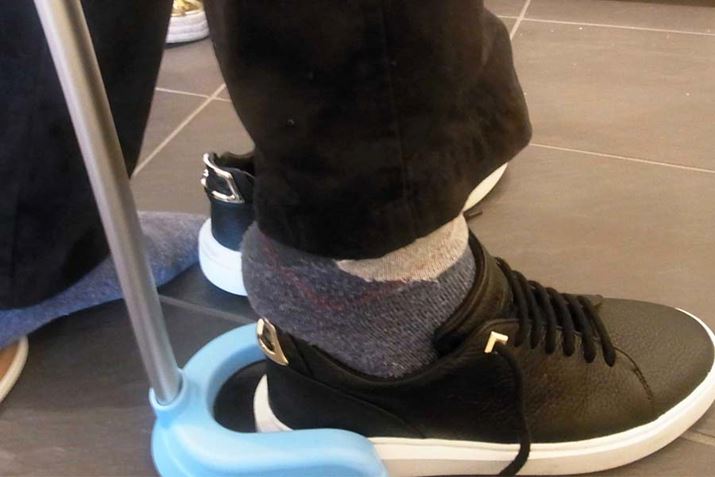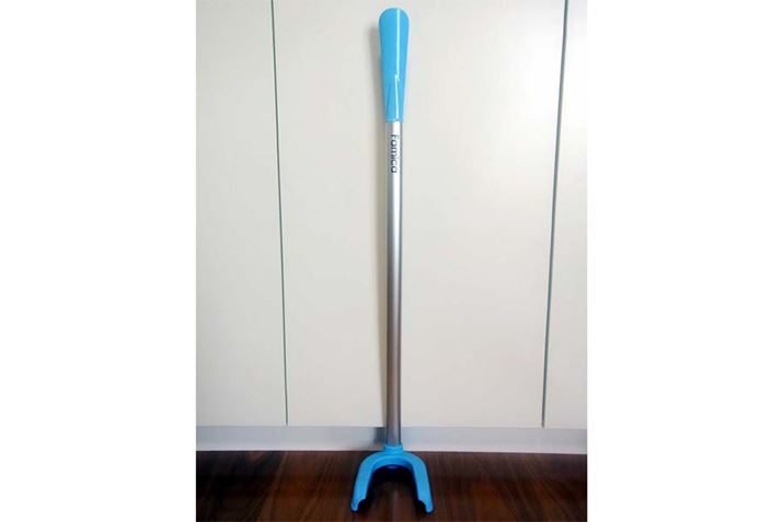 筆者が購入したのは、さまざまな医療・福祉・健康用品を開発、販売する株式会社竹虎の「ファミカ・シューヘルパー」。靴を履いたり脱いだりするのをサポートしてくれるグッズというわけです。主に立った状態で使うなら、筆者が購入した全長76.5cmの通常タイプのものが合いますし、イスなどに腰掛けた状態で使うなら、全長が56.0cmのショートタイプがよさそうです。それでは実際に使ってみましょう。