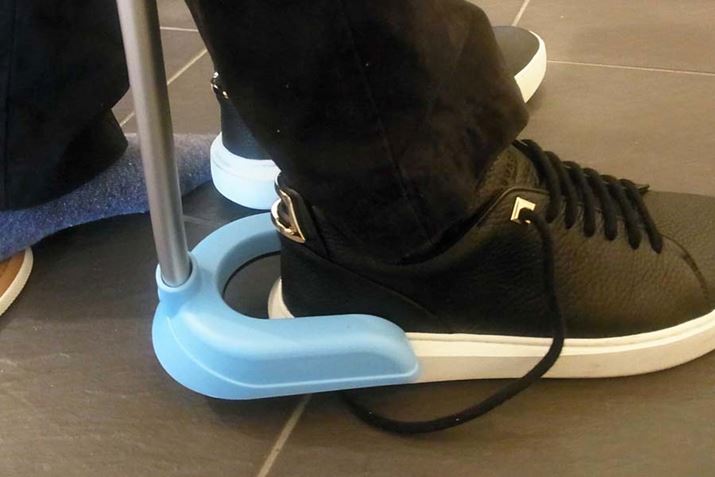 靴を脱ぐときは取っ手のほうを持って、本体を靴のふちにかぶせるようにします。かかとにはめて押さえれば、簡単に靴が脱げます