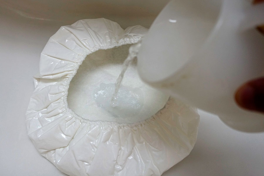 このナイトキャップっぽいアイテムに3分の2カップくらいの水を入れ、吸水性のある素材でできた内側にしみこませます