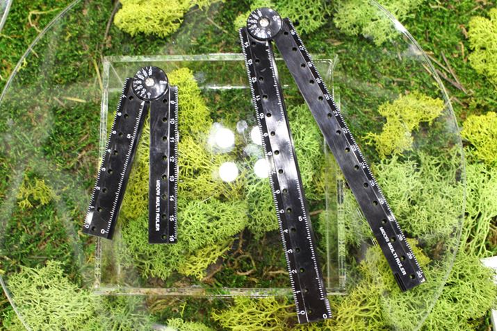ロングセラーの折りたためる定規のブラックモデル。開いた状態の内側には、高さや奥行が測りやすいグランドポイントの目盛りが付く。15度ずつクリックが効きながら開くので、角度も簡単に測れる