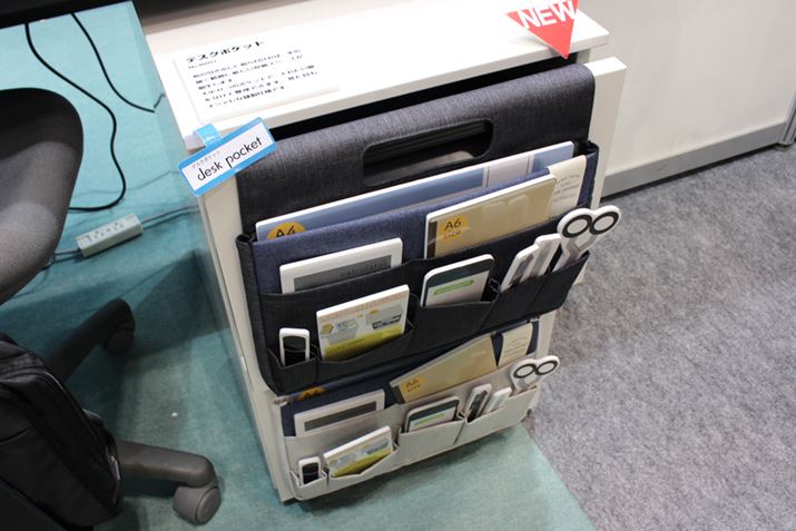 デスクの引き出しに取り付けるだけで、ノートや電卓などのワーキングツールを収納できる。印鑑やスマートフォンが取り出しやすい小ポケット、電卓やメモ帳などが入る中ポケット、A4サイズのファイルやノートが入るA4ポケットなど、8つのポケットが付いている。引き出しの前板にかけ、内蔵の磁石で固定するだけで簡単に取り付け可能