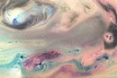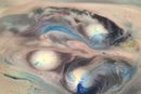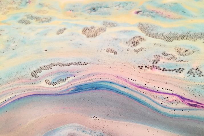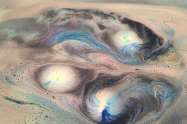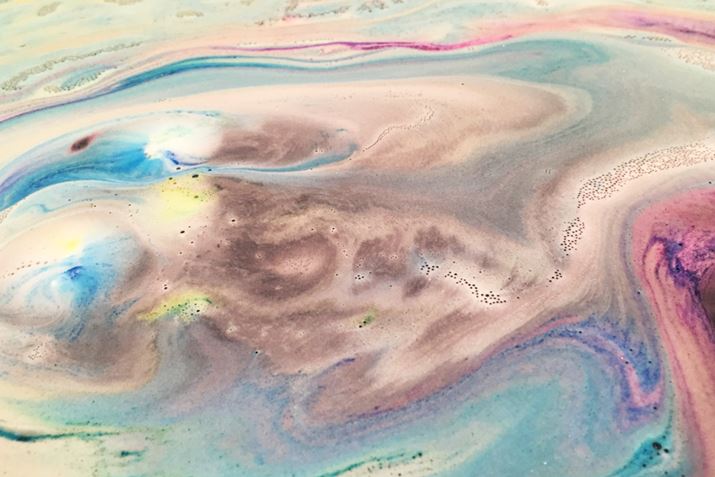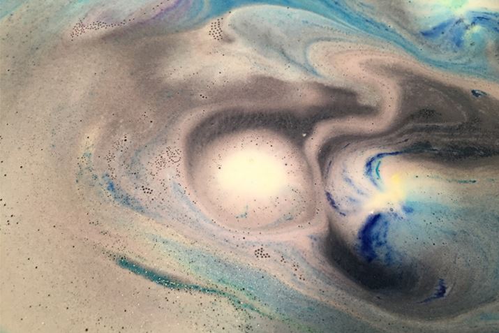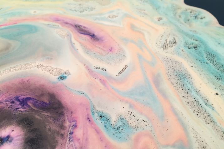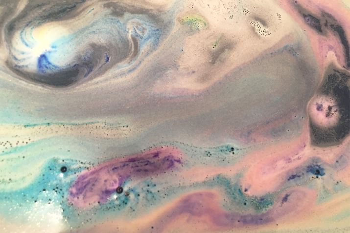 バスボムを入れた途端、お湯に過剰なまでに反応して自転を繰り返して、浴槽内を移動しながらいくつもの銀河や星雲を発生させております…。気泡が次々にリズミカルにはじけながら、カラフルかつダークな色合いを放ち、予測できない形状に。そして、よ〜く見ると、何億万ものラメによる星々!!