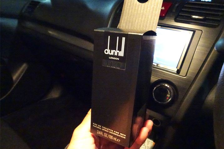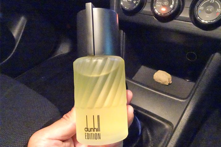 そんなアルファロメオのフレグランス・シートは、マニア向けのクルマ関連の雑貨屋さんや正規販売店のアレーゼ店の一部で入手できるものの、香りがすぐに抜けて薄れてしまうので、香りの元となる香水を入手して補充する人が少なくありません。どうやらシャネルの「アンテウス」というフレグランスが一番近い、あるいはそのものであるとの話が有力ですが、シャネルのアンテウスは50mlで1万2千円以上と、消耗品としては結構なお値段。もう少しリーズナブルでアルファロメオの香りに近いフレグランスはないかと探してみたところ、とあるカーマニアさんのブログで「ダンヒル・エディションが近い」という意味のことが書かれてあるのを発見。試しに買ってみました。