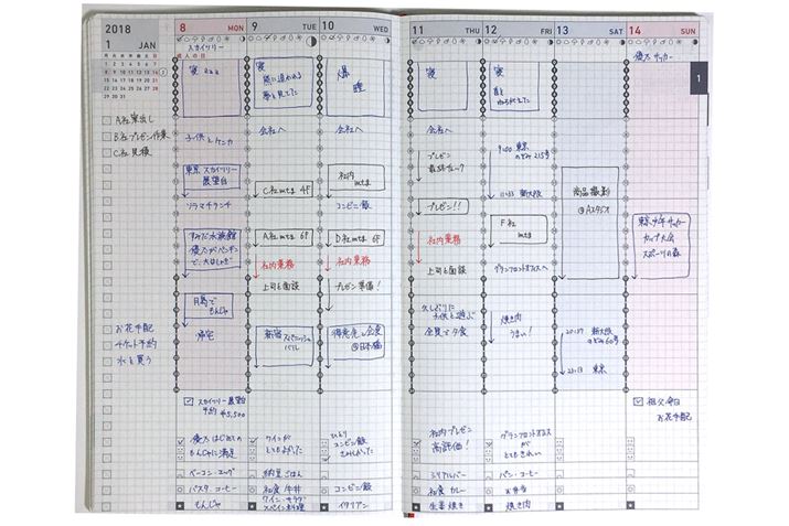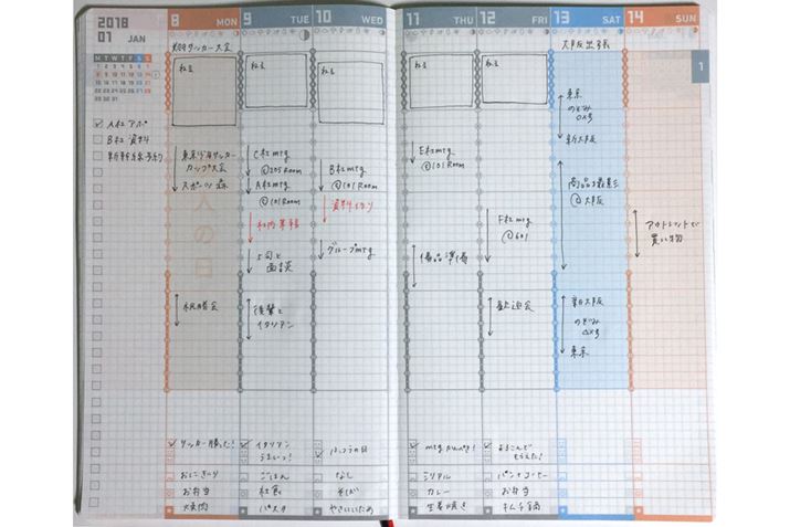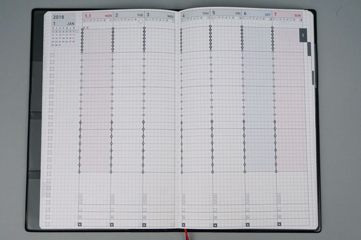 しかし、左ページの左端にあるToDoリストの項目数や、1時間の書き込みスペース(縦2マス×横9マス)の大きさなど、ページのレイアウトに変更は見られないし、ページ数も同数と、内容に関してはまったく同じと考えてよい。