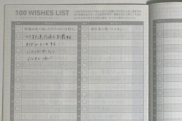 「LIFE」内にある「人生でやりたい100のリスト」。1年で終わりではなく、年を越しても残しておきたい情報を記録できる。「LIFE」は差し替えられるので、新しい手帳に書き写す手間がなく、一生使い続けられる冊子となる。ほかに「座右の銘リスト」「人生設計表」などが収録されている