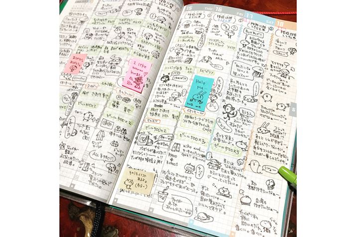 「ジブン手帳 mini」の書き込みを投稿し、フォローワーを5700人以上抱える「まめぴなつ」さんの使用例。バーチカルの時間軸に、イラストを使ってかわいく自由に記入している。使用しているボールペンは、三菱鉛筆「ユニボール シグノ 超極細 0.28mm 黒」やパイロット「ゲルインキボールペン ジュース リーフグリーン 超極細0.38mm」だそう