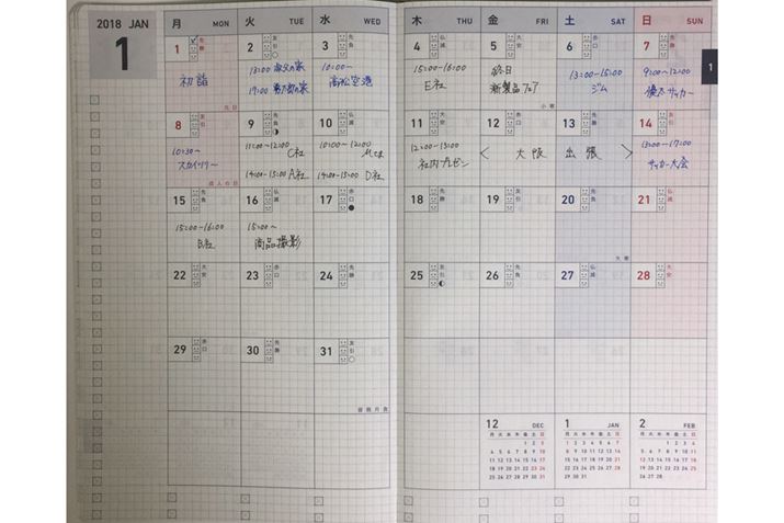「マンスリー」は、月の予定を一覧できるブロック型スケジュール。曜日名を漢字でも表記し、認識しやすくなっている。12月始まりで翌年1月まで使用可能