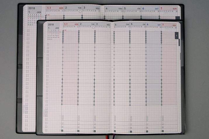 2017年版からの進化ポイントは、製本形式にある。ページを開いたときに180°フラットに開く製本形式を採用し、とじ部分の近くでも書きやすくなった。