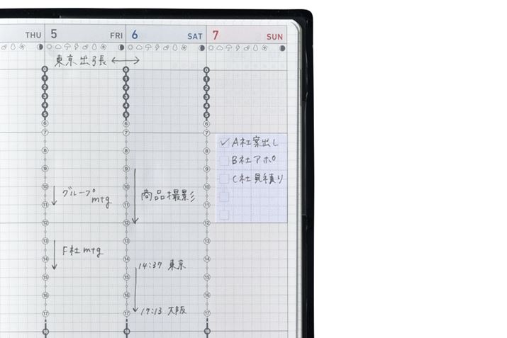 「ジブン手帳 Biz」の中には、「ジブン手帳」にも採用されている「DIARY」のビジネスカラーモデルのみ入っている。メインとなるのは、見開き2ページに1週間分の縦軸タイムスケジュールが書き込める「24時間バーチカルレイアウト」で、明るい色で構成されていた「ジブン手帳」のものよりも、薄めのカラーで印刷されているのが特徴だ。