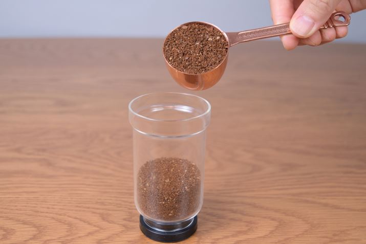 続いて、ストレーナーの内側の線までコーヒー粉を入れる。これでだいたい32〜35gとなり、挽き方は中挽き〜粗挽き。細挽きだとコーヒー粉の密度が高すぎるため、うまく水が通り抜けずあふれてしまうのでご注意を