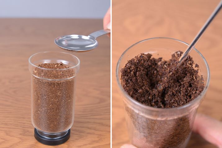 コーヒー粉に水が浸透しやすくなるよう、「大さじ1杯の水を加えては混ぜる」を2回繰り返す。強いて言えばこの混ぜ方に得手不得手の差が出るかもしれないが、全体にムラなく水分が行き渡るようにザックリ混ぜればいいだけなので、ハンドドリップのさまざまな作法に比べればよほど簡単