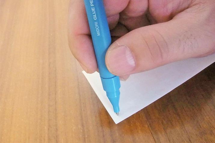 そう、本体を押してやるとペン先からのりが出てくるワケです。構造的にはチューブのりのようですが、狙った狭い場所に確実にのりをぬれるのがポイント。ただし、商品の特性上、用紙の角などの細かい場所にのりをぬるのに適していますが、広い場所は苦手です。