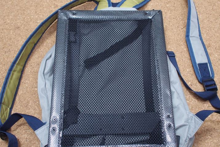 リュックサックに装着したところ。メッシュ部分とリュックサックの間に隙間ができています