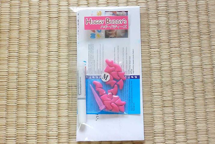 「猫用ソフトネイルキャップ」。爪を切った後にこれを装着すれば、壁や家具で爪を研がなくなります。爪の生え変わりとともに外れるので、外れたらまた爪を切って新しいものを着けていきます。完全室内飼いの猫であれば、ぜひ試してもらいたい商品。見た目もかわいいし。