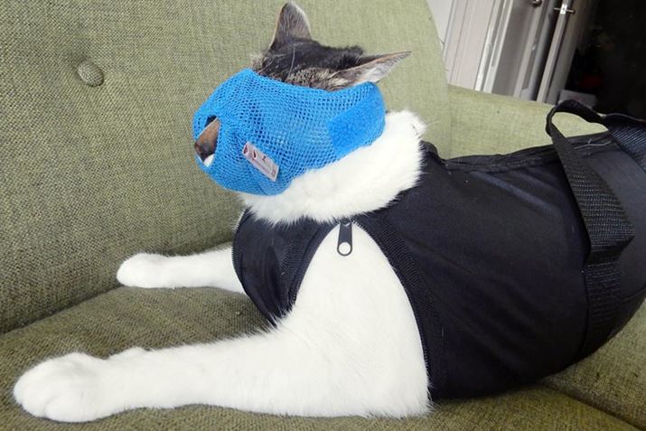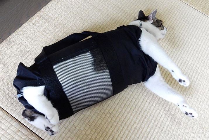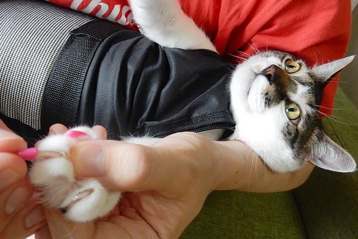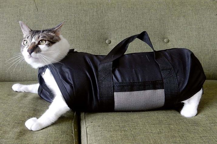 猫は洗濯ネットに入れるとおとなしくなりますが、それだと爪が切れないんですよね。でもこれは、顔と足の出口がファスナーになっているので猫に合わせて調節ができます。まさに爪を切るのにうってつけ。