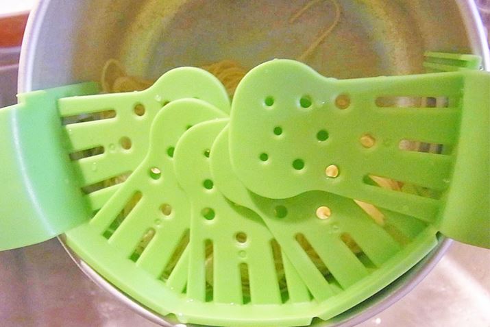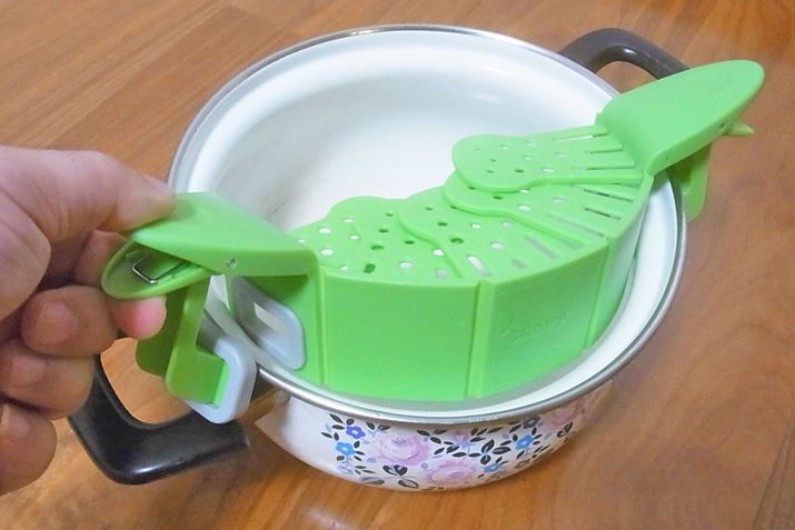 筆者が購入したのは「スナップビット(Snapbit)」という商品。自宅にあるいろんなサイズの鍋やフライパンなどに取り付けるだけで、面倒くさい湯切りが楽々できちゃうというすぐれものです。これまでも湯切り用のキッチングッズはいろいろと発売されていましたが、使える鍋の大きさが限定されていたりして、手持ちの鍋では使えない!!! なんてことも。しかし、「スナップビット」ならサイズを変えられるので、いろんな大きさの鍋、フライパンやボウルなどでも使えます。それでは使い勝手をチェックしてみましょう。