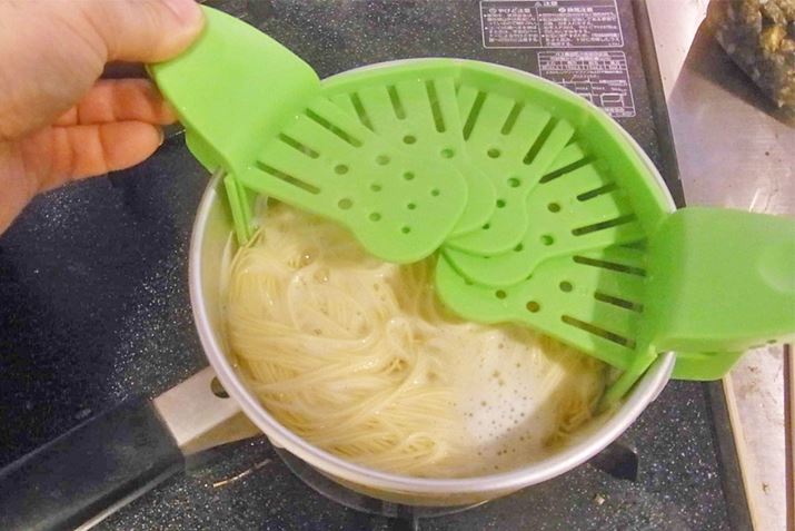 麺をゆで終わって湯切りする前に「スナップビット」を取り付けます。小さな鍋は取り付けに手間取って中身をこぼしたりする可能性がありそうなので、事前に取り付けやすさをチェックしておいたほうがよさそうですね