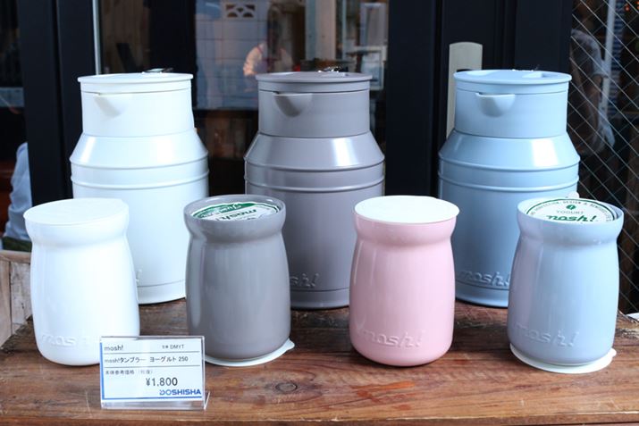 「mosh!卓上ポット」(奥)の価格は3,800円(税別)、「mosh!ボトル ヨーグルト」(手前)の価格は1,800円(税別)
