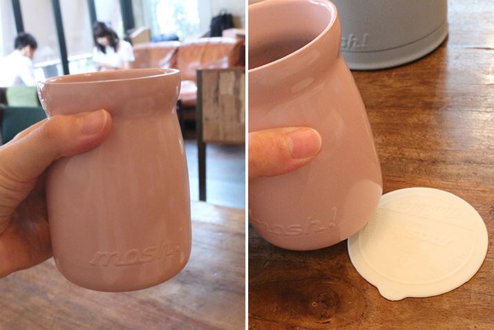「mosh!ボトル ヨーグルト」はセラミック塗装で陶器のような質感を再現。女性の小さな手でも持ちやすい形とサイズ(左)。コースターにもなるシリコン製のふたが付属する(右)