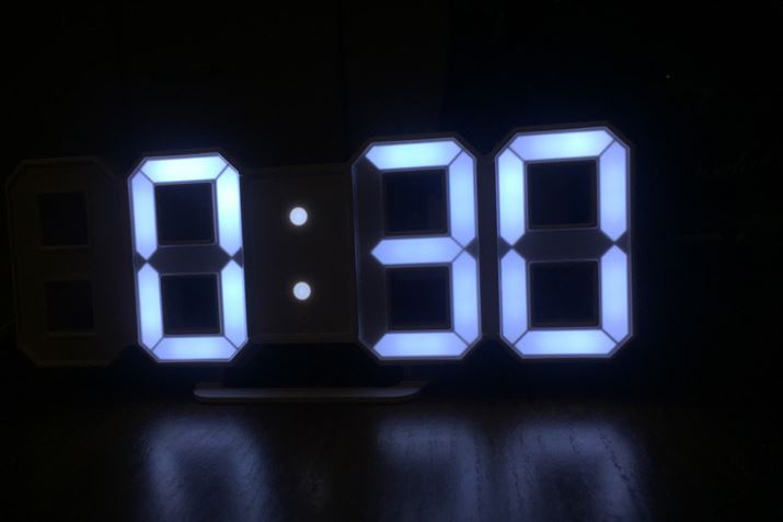 ご覧のように、この時計はLEDライトによるデジタル時計で、まるで数字だけが浮いて見えるようなデザインなのです! 部屋を暗くして、少し離れたところから撮影してみましょう。