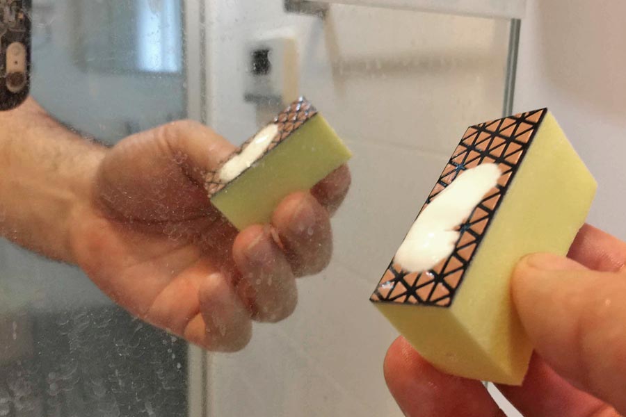 水をつけて磨くだけ。小ぶりのスポンジ程度のサイズがあるので一気に広い面をこすれます