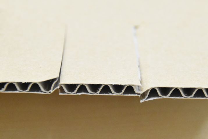 左が「エクスシザース」で、右が2,000円程度のハサミで切った跡。「エクスシザース」の切り口は潰れていないが、2,000円程度のハサミだと段ボールが押し潰されたように切り口が汚い