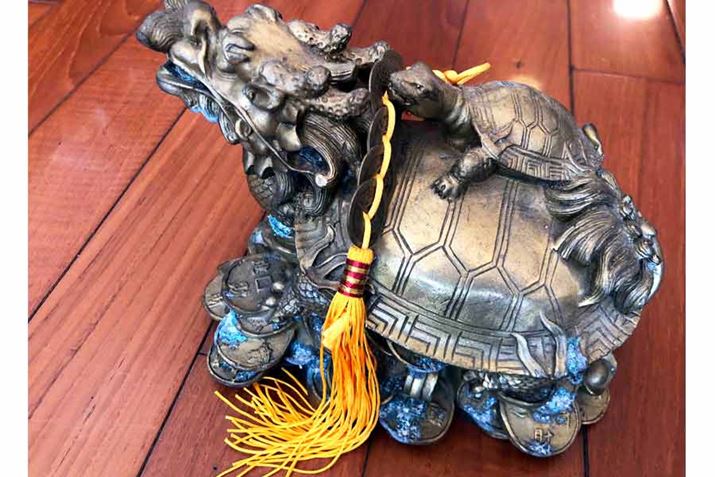 縁起物として古くから親しまれている亀の置物。こちらはずっと以前から実家にあるもの。ちょっとサビが出ていますが、実家の守り神です