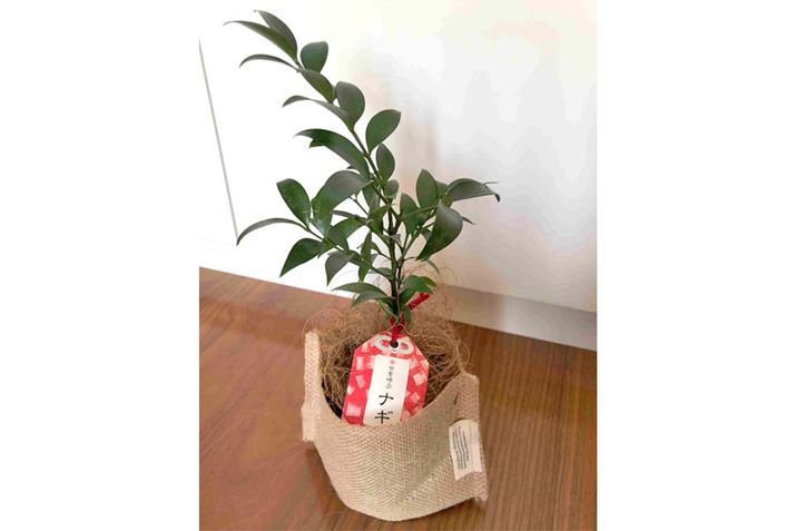 筆者が購入したのはこちら。鉢の部分が麻袋になっています(LAND PLANTS 縁結びの木 梛(ナギ) 麻袋鉢カバーセット)