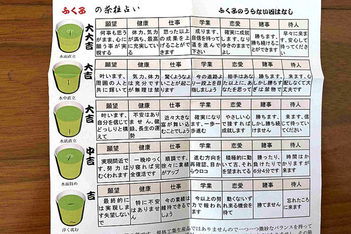 茶柱の立ち方によって運気が異なるようです。水面でまっすぐに立つのが“大大吉”。何事も思うがままに願い事が実現するそうですよ♪