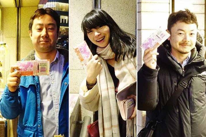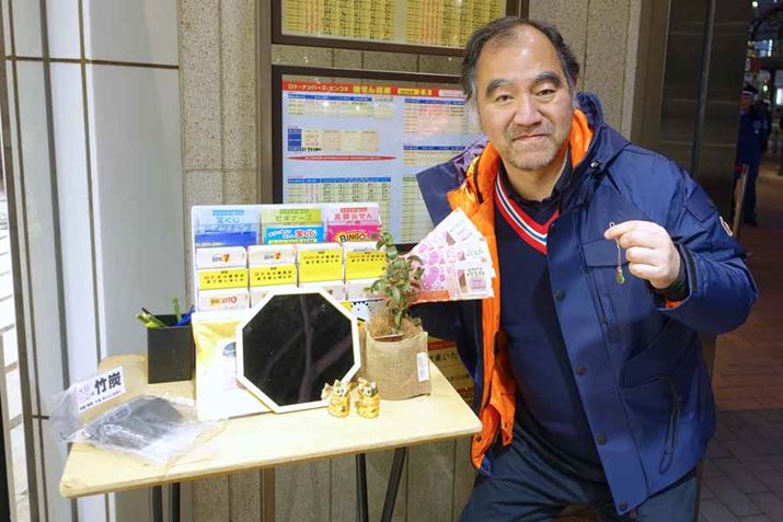 今回は編集部のスタッフも同行。まずは開運グッズに祈りを捧げ、小手調べにスクラッチくじを10枚×3人分を購入してみました。
